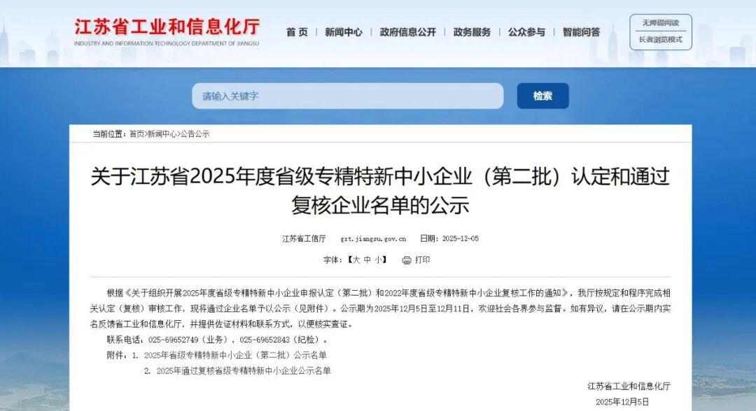 近日,江蘇省工業(yè)和信息化廳正式公布了2025年度江蘇省“專精特新”中小企業(yè)認定名單,南京新遠見智能科技有限公司憑借專業(yè)化深耕、精細化管理、特色化創(chuàng)新與持續(xù)的技術(shù)突破,成功躋身榜單! 這一榮譽不僅是政府部門對入選企業(yè)綜合實力的權(quán)威認可,更是新遠見智能科技多年匠心堅守的成果體現(xiàn)。